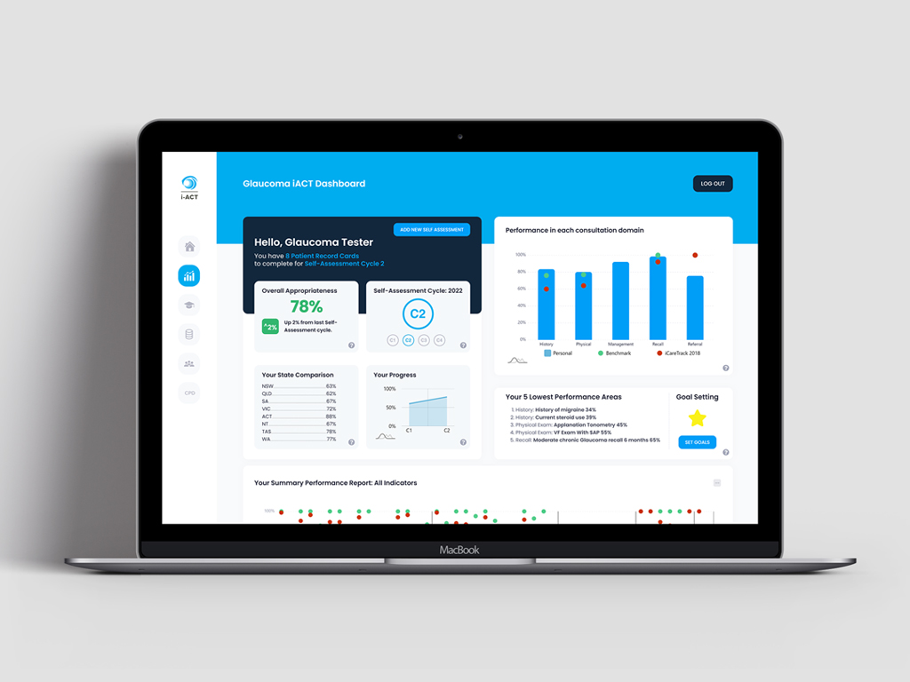 The iCareTrack website and i-ACT (iCareTrack Assessment of appropriateness Clinical practice) Tool is an educational program aimed at helping optometrists deliver appropriate eyecare to their patients. This educational program was developed using a theory-based approach that targeted barriers and enablers of eyecare delivery combined with co-design with optometrists, patients and stakeholders.